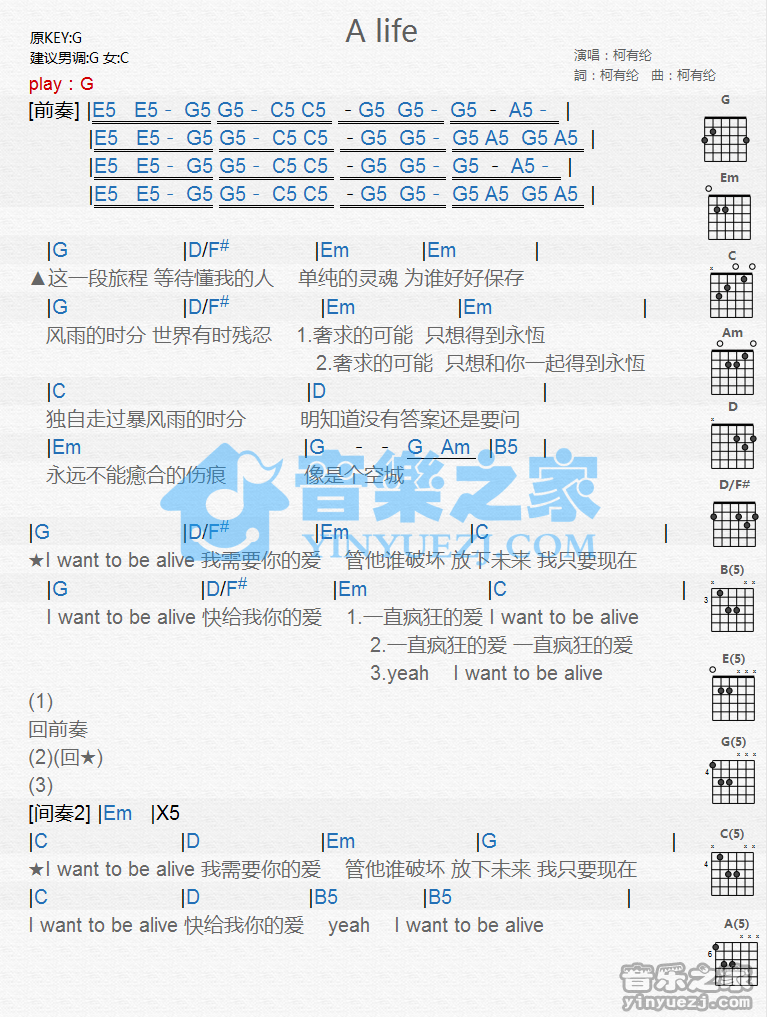G调版《ALife》吉他和弦弹唱谱...