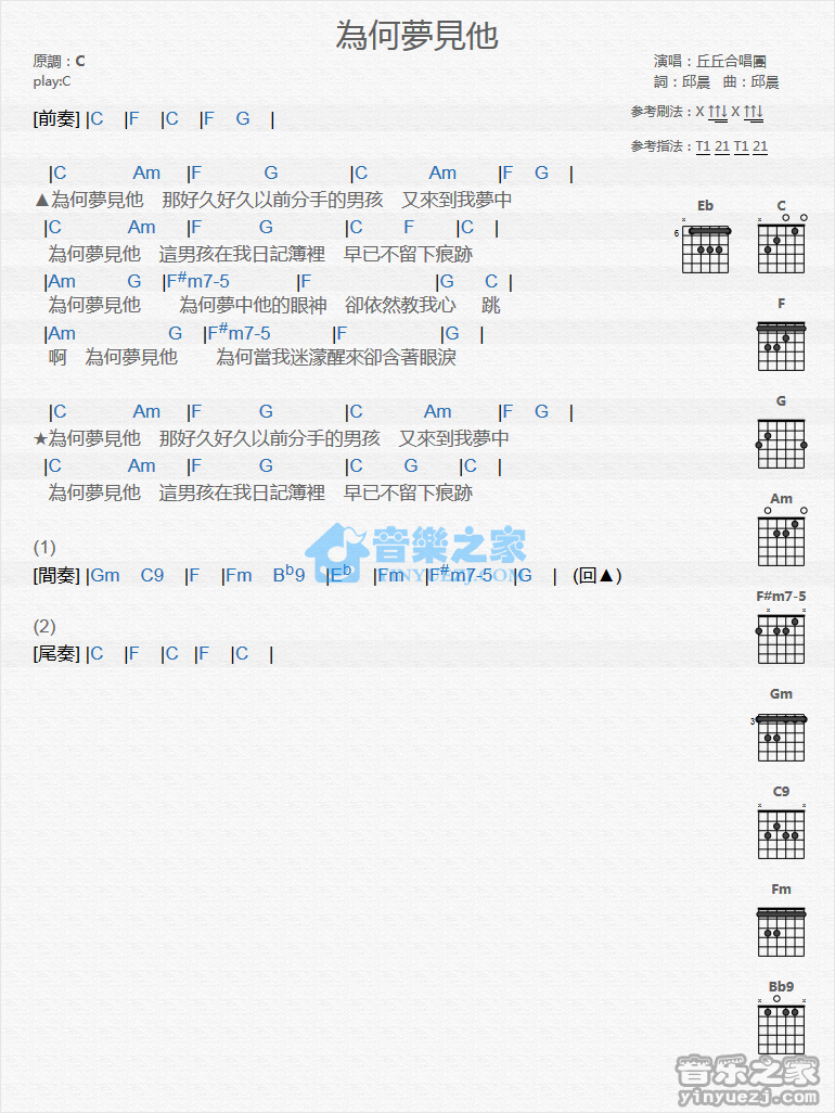 C调版丘丘合唱团《为何梦见他》吉他和弦弹唱谱...