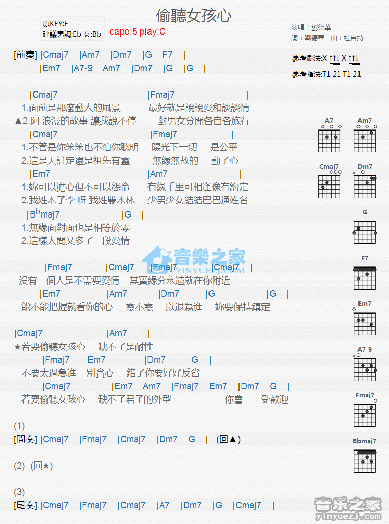C调版刘德华《偷听女孩心》吉他和弦弹唱谱...