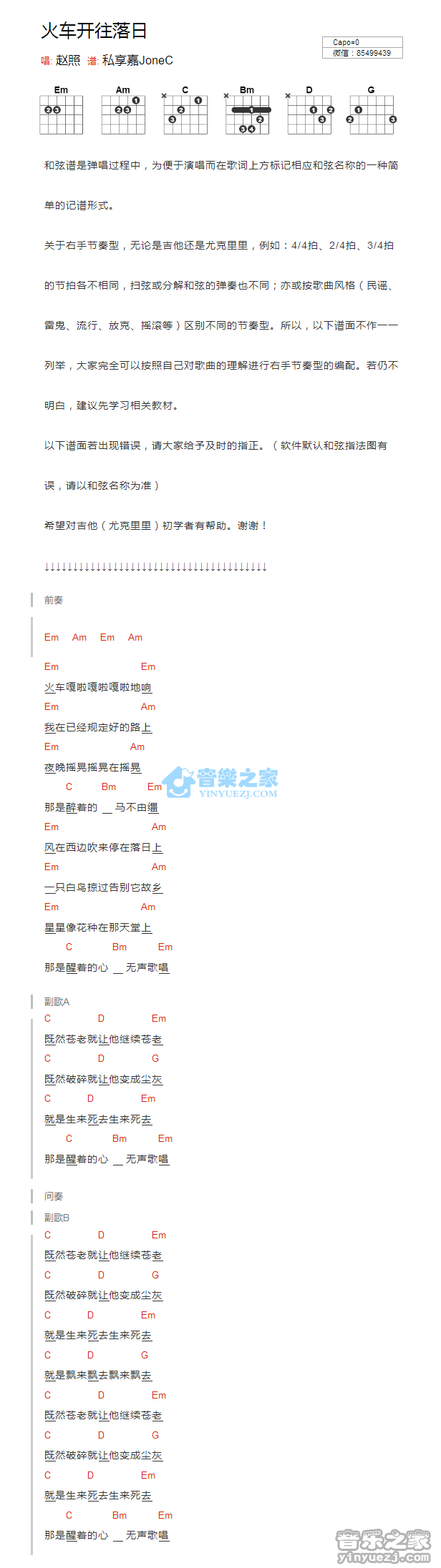 赵照《火车开往落日》吉他和弦弹唱谱...
