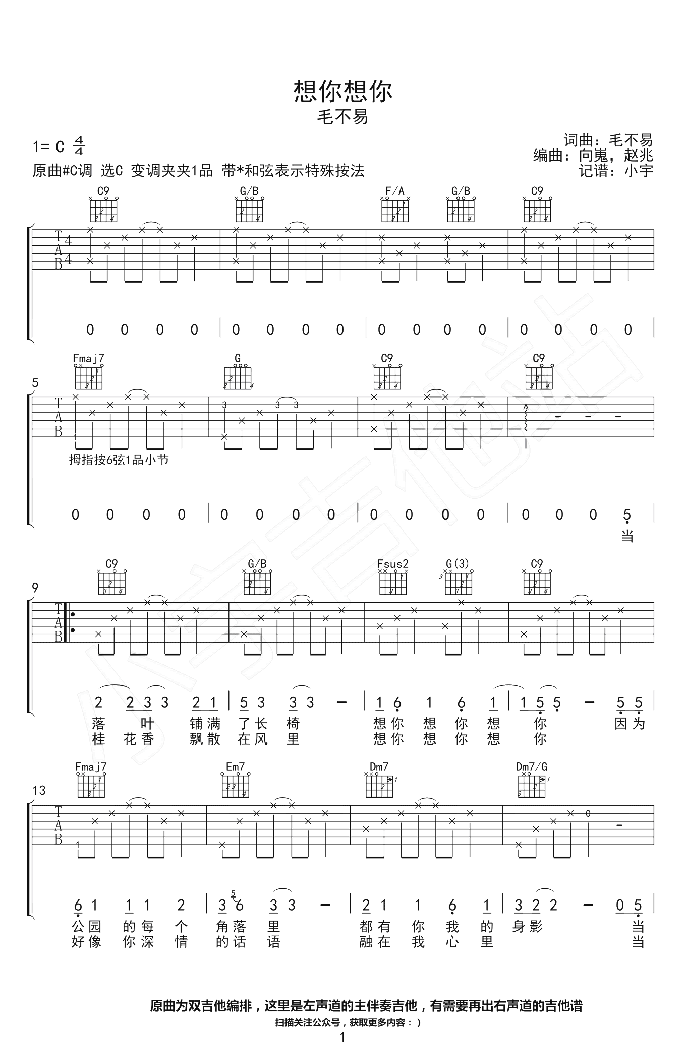 吉他毛不易《想你想你》吉他谱
