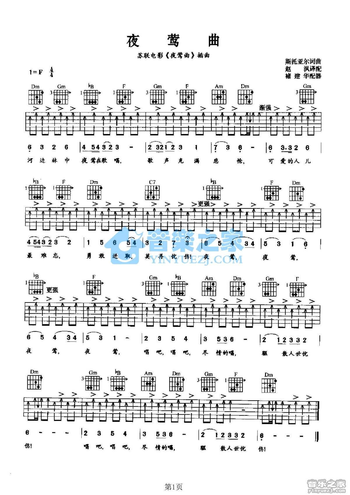F调版苏联歌曲《夜莺曲》吉他弹唱六线谱...