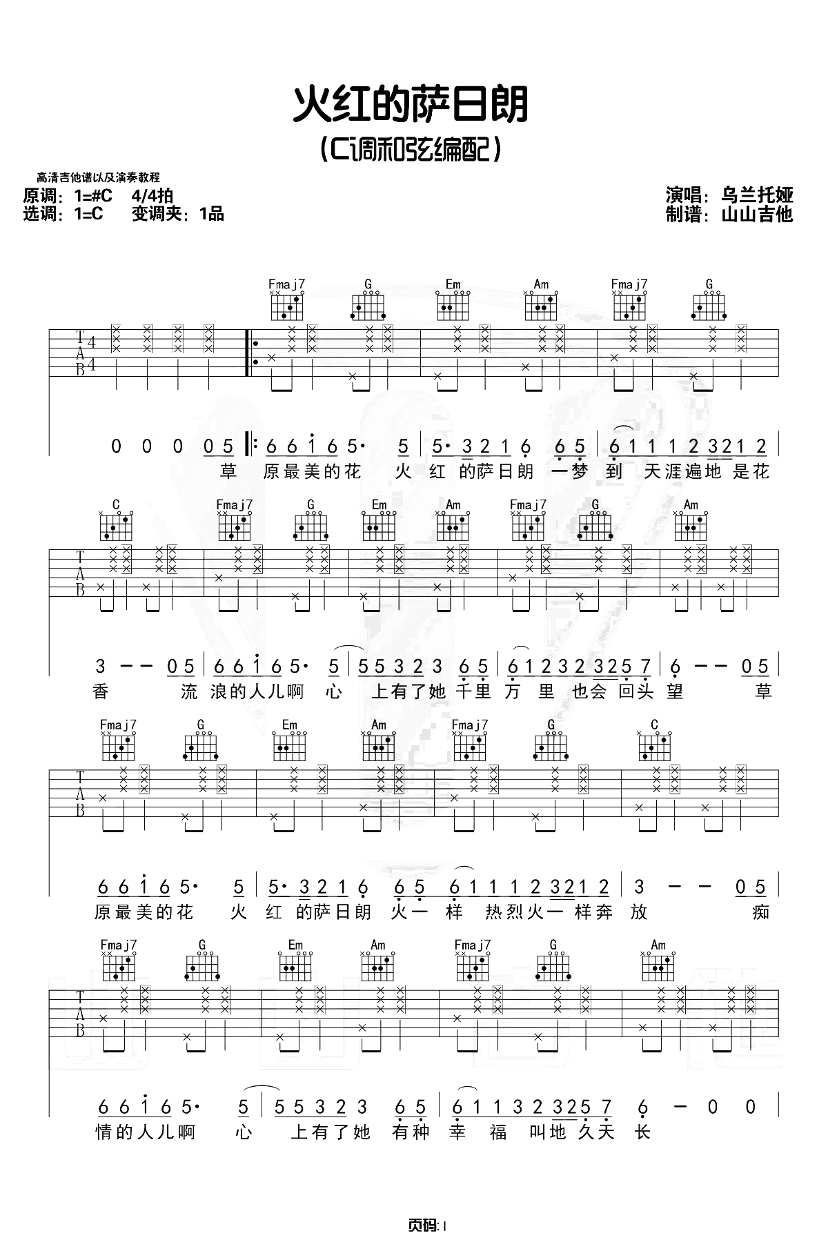 《火红的萨日朗》吉他谱,乌兰托亚演唱的一首草原牧歌,最近由要不要买菜翻唱而爆红网络。火红的萨日朗六线谱,C调和弦编配。萨日朗是一种草原之花,颜色鲜红,就像火一样,这首歌曲以火红的萨日朗为名,象征着对美好生活的向往,正如歌词所说,绵延大道有多远,幸福生活有多长。...