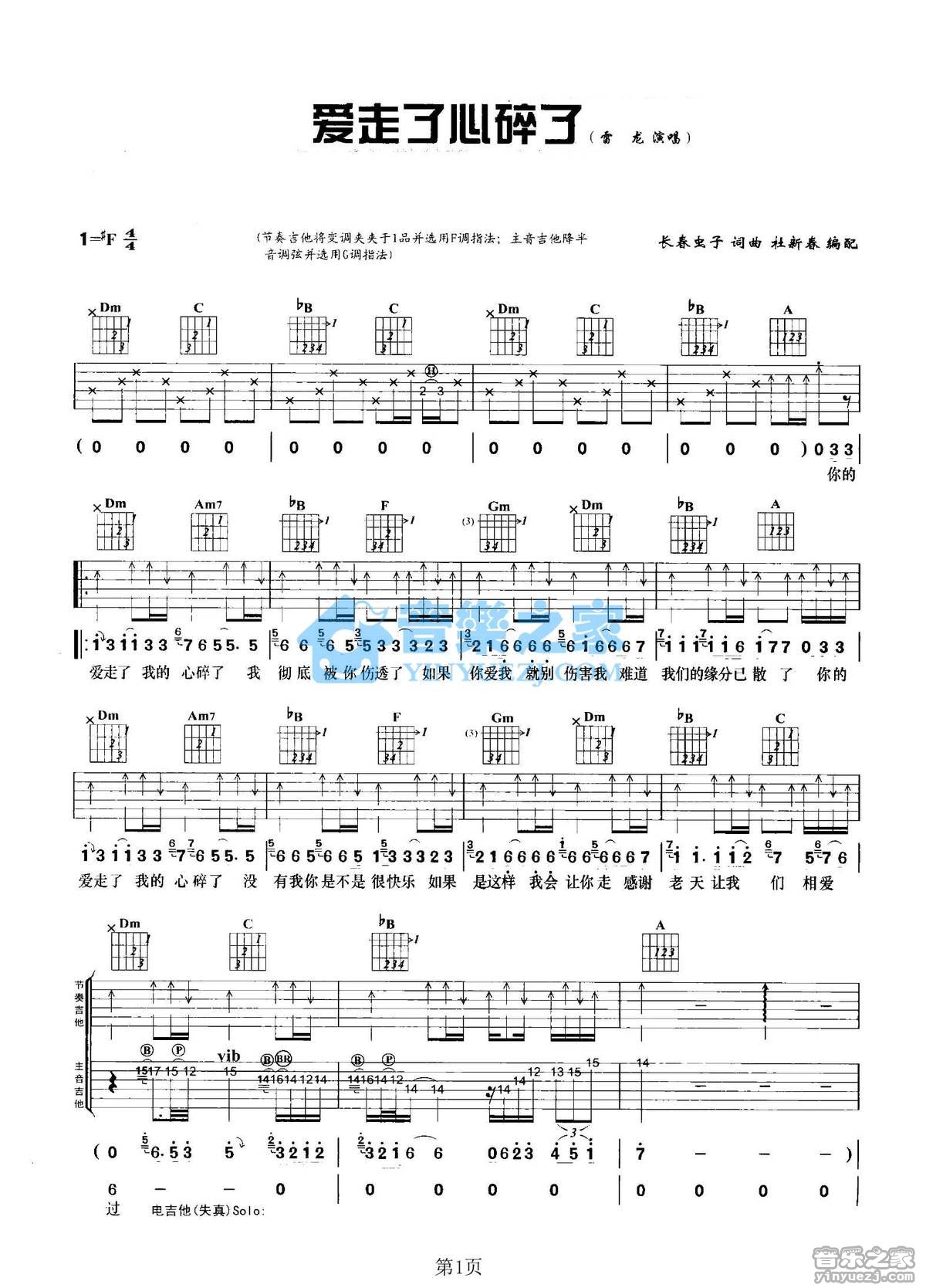 F调双吉他版雷龙《爱走了心碎了》吉他弹唱六线谱...