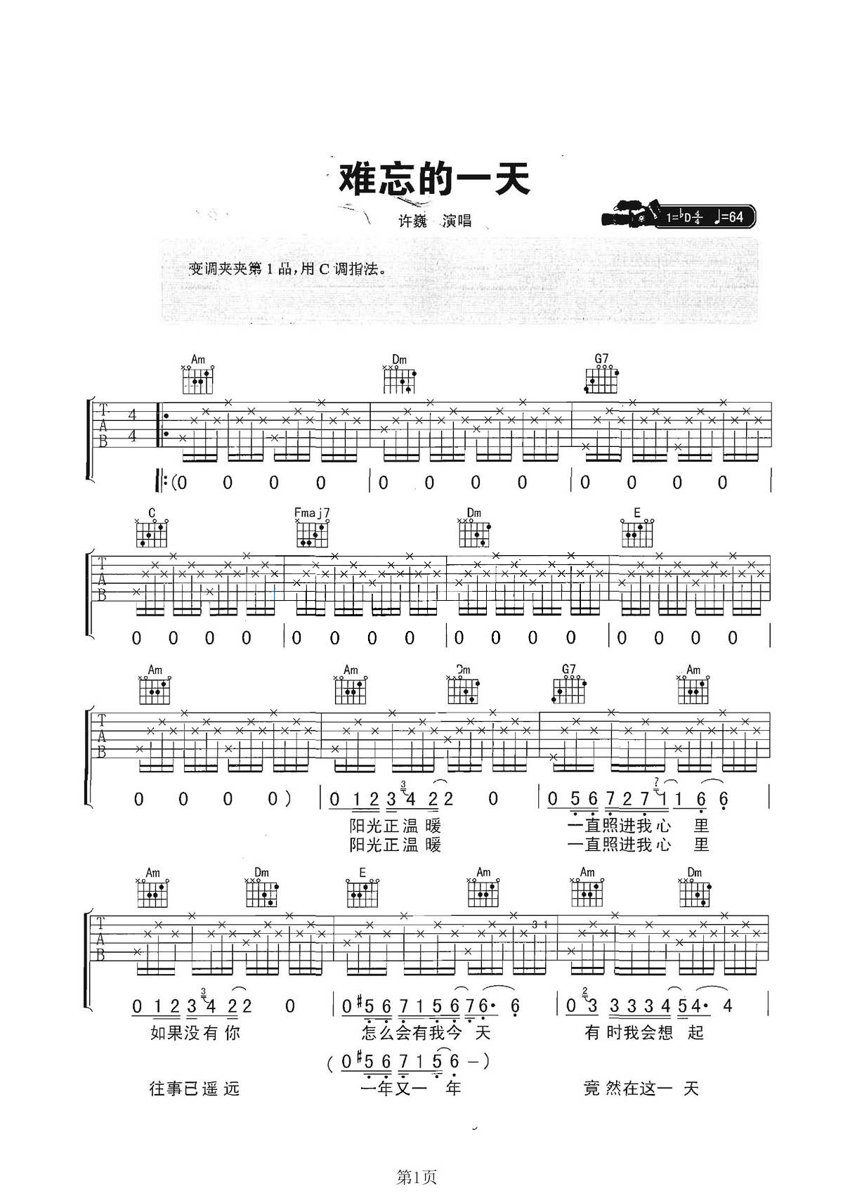 吉他许巍《难忘的一天》吉他谱 - 好听到爆炸