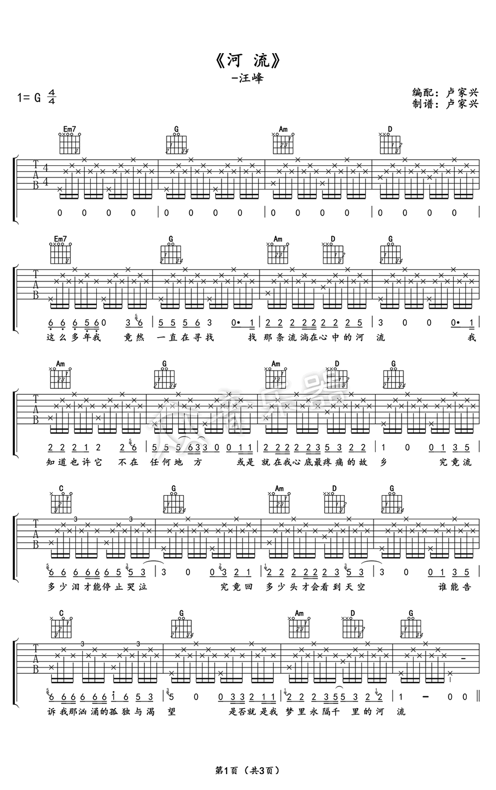 河流吉他谱,汪峰新专辑主打歌曲,整首歌曲弹奏都很简单,没有大横按,和弦走向也很有规律,琴友们弹两遍就应该可以记住了。间奏部分如果是一把吉他建议就直接扫四小节就行了,这里编成了双吉他,录音的朋友可以试试。...