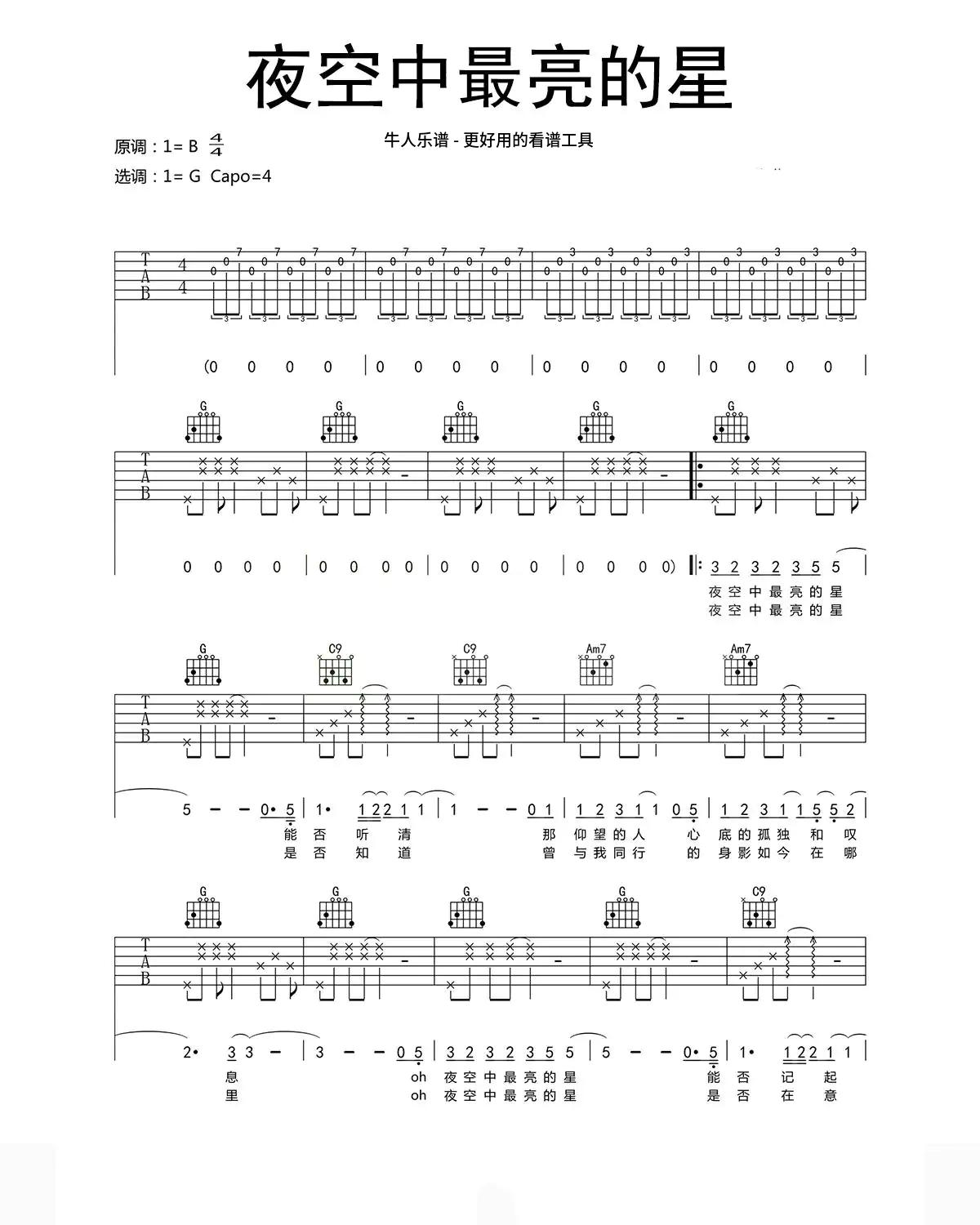 吉他逃跑计划《夜空中最亮的星》吉他谱 - 牛人乐谱编配