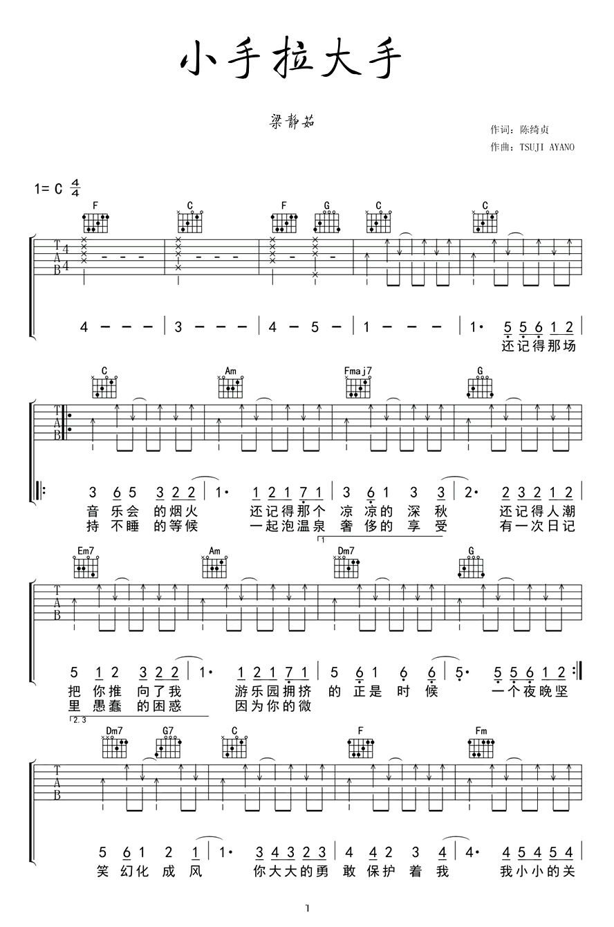 《小手拉大手》吉他谱_梁静茹_C调弹唱六线谱_高清图片谱分享,《小手拉大手》是由陈绮贞填词,梁静茹演唱的一首歌曲,这首歌翻唱自动画电影《猫的报恩》片尾曲《幻化成风》。其实很多情侣十指紧扣的时候,你会发现其实都是像小手拉大手一样的,所以这首歌的名字就是这样来的。这首歌整曲都非常的活...