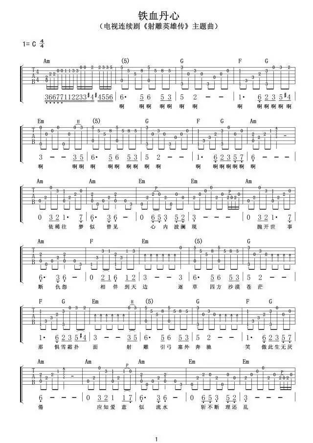 电视连续剧《射雕英雄传》主题曲,随谱附上凡歌吉他带来的《铁血丹心》指弹吉他示范教学视频,简单好听,一学就会!琴友们练习起来吧。...