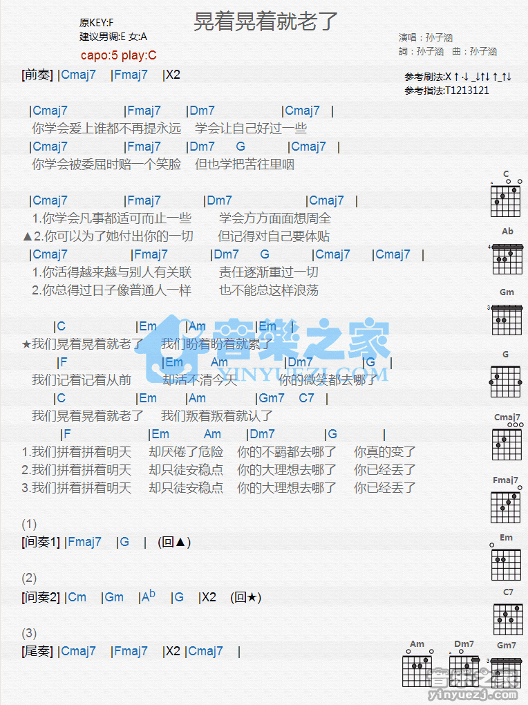 C调版孙子涵《晃着晃着就老了》吉他和弦弹唱谱...