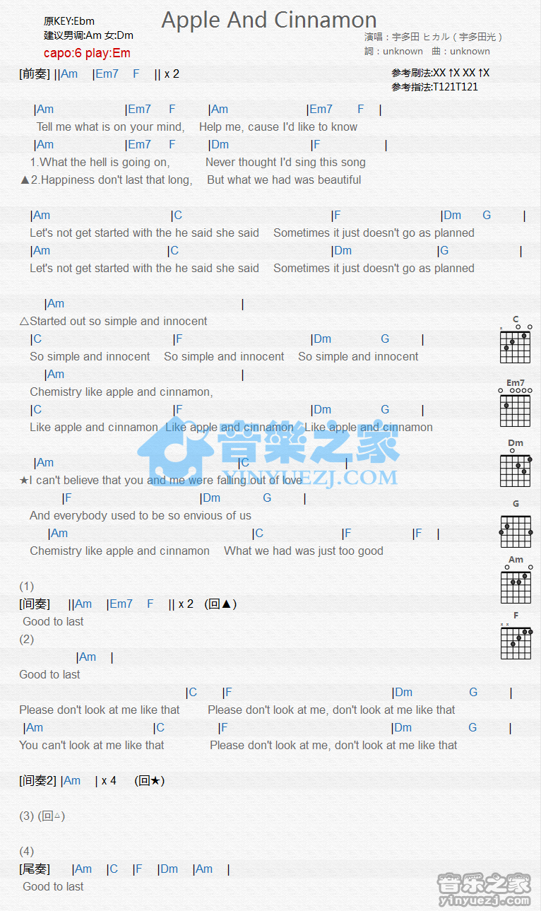 Em调版宇多田光《AppleAndCinnamon》吉他和弦弹唱谱...