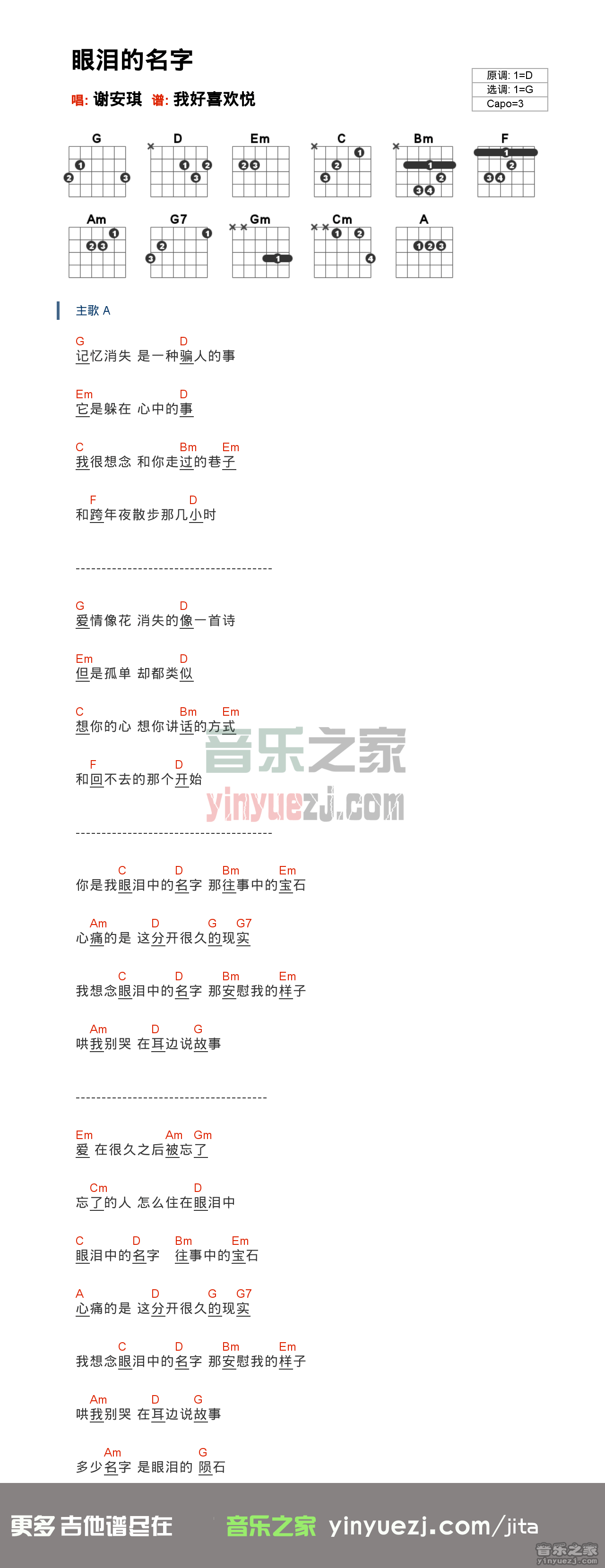 谢安琪《眼泪的名字》吉他谱,YYZJ编配出品,共有1张高清图谱,免翻页排版设计。...