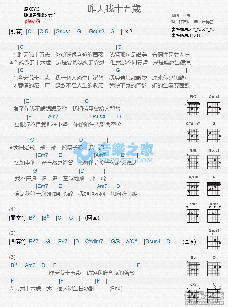 G调版《昨天我十五岁》吉他和弦弹唱谱...