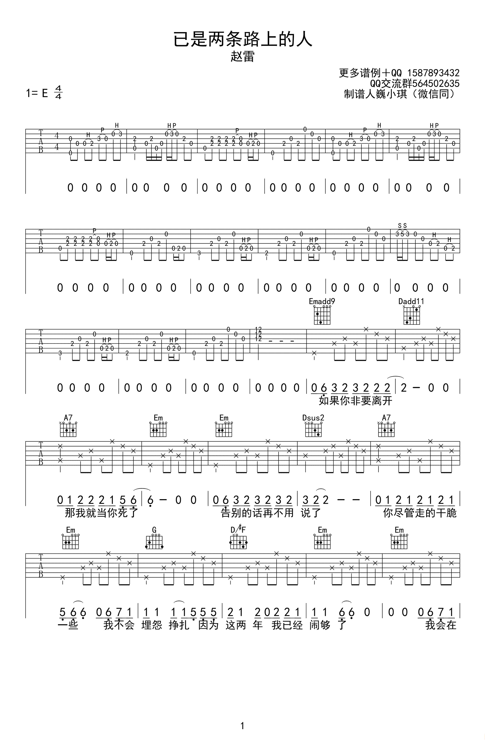 赵雷《已是两条路上的人》吉他谱,高清弹唱谱,这是一首忧伤的民谣歌曲,每一句每一字都充满了绝望无奈心痛,也许,对于真正的爱情,往往没有中间选项,要么深爱要么一刀两断。既然这样,那就挥手告别。谢谢你,满载了我的青春,谢谢你,曾经爱过我,也谢谢你,给了我新的生活,虽然我们已是两条路上的...