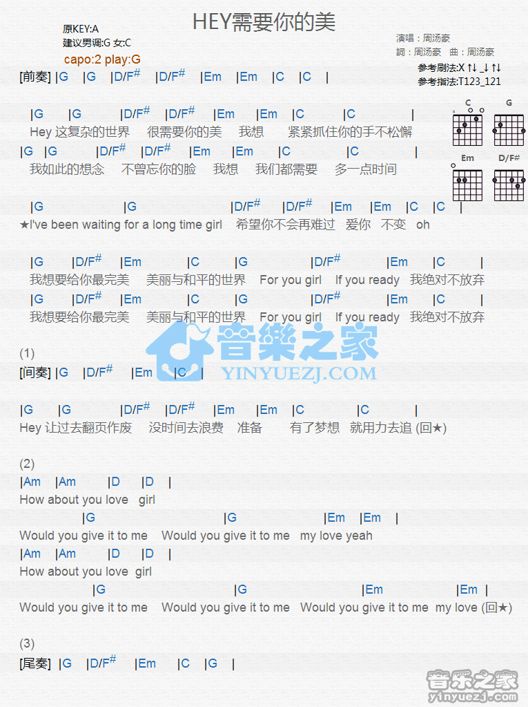 G调版周汤豪《Hey需要你的美》吉他和弦弹唱谱...