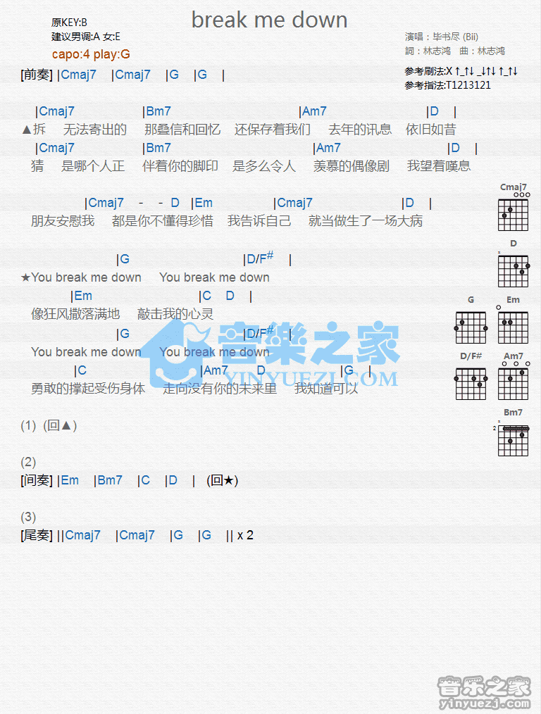 G调版毕书尽《BreakMeDown》吉他和弦弹唱谱...