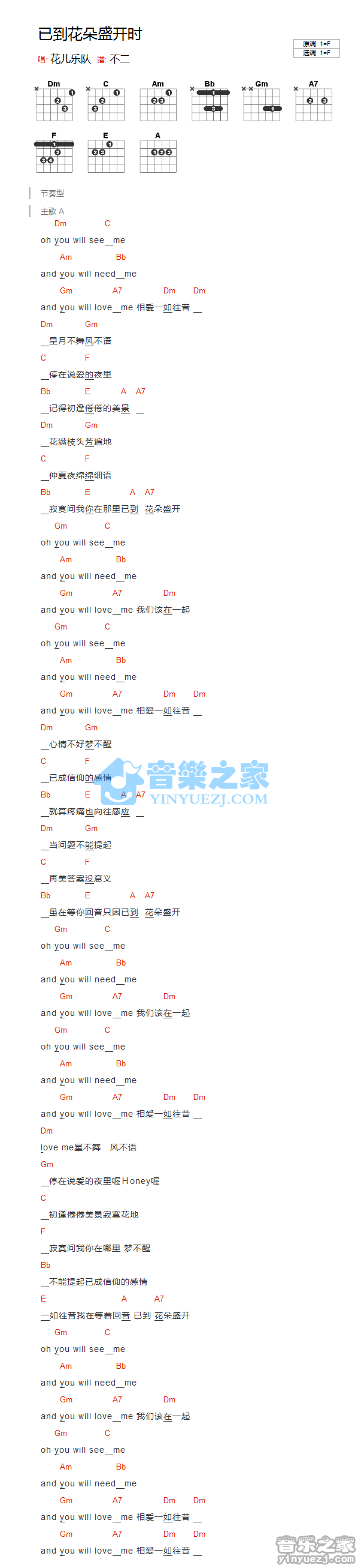 F调版花儿乐队《已到花朵盛开时》吉他和弦弹唱谱...