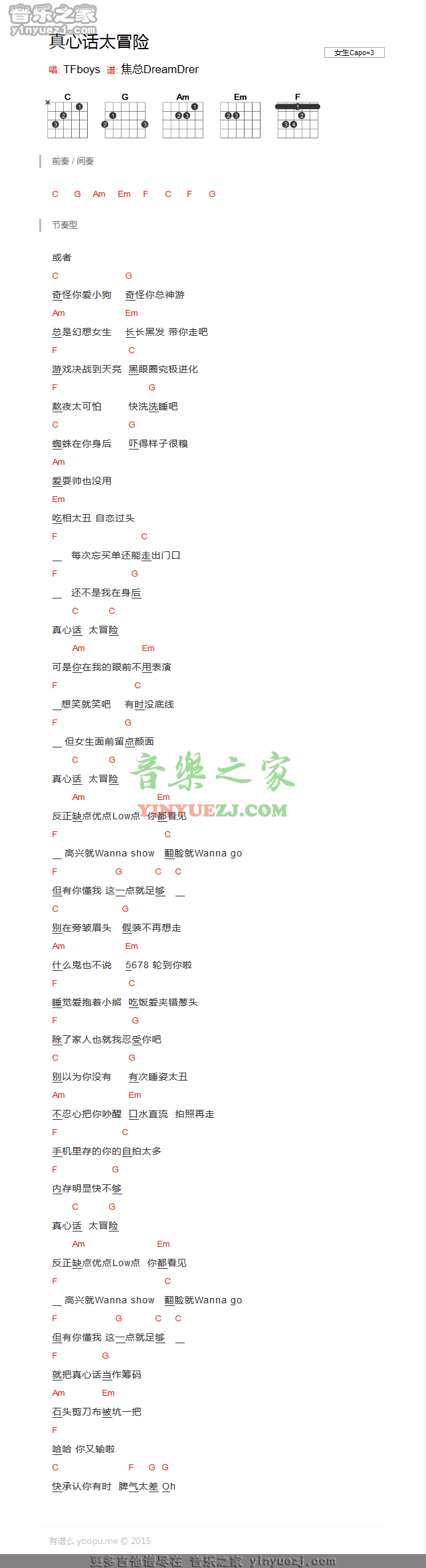 TFBOYS《真心话太冒险》吉他谱,YYZJ编配出品,共有1张高清图谱,免翻页排版设计。...