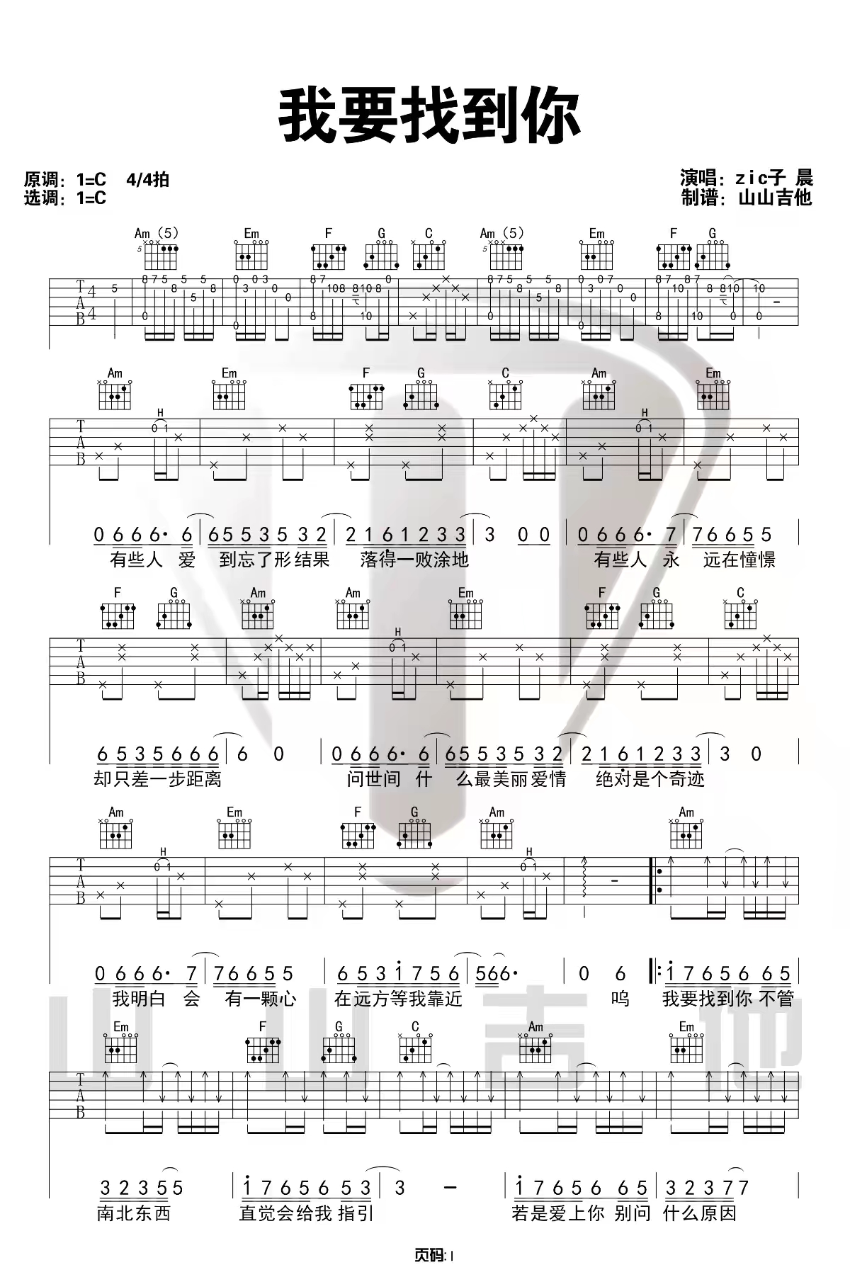 子晨《我要找到你》吉他谱,山山吉他编配出品,共有3张高清图谱。...