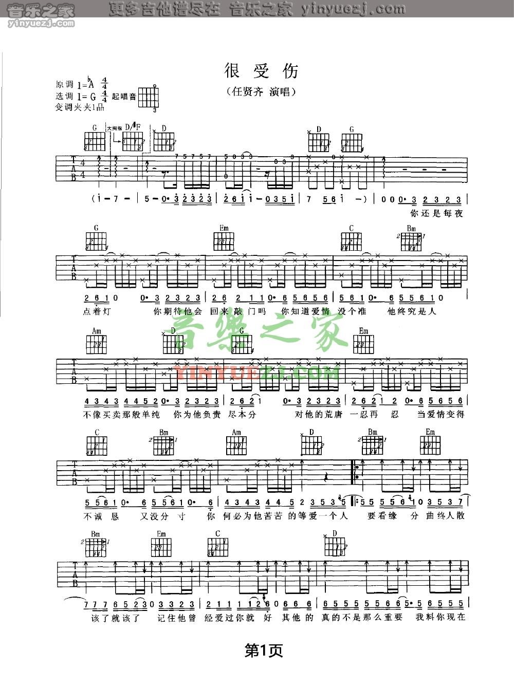 任贤齐《很受伤》吉他谱,YYZJ编配出品,共有3张高清图谱。...