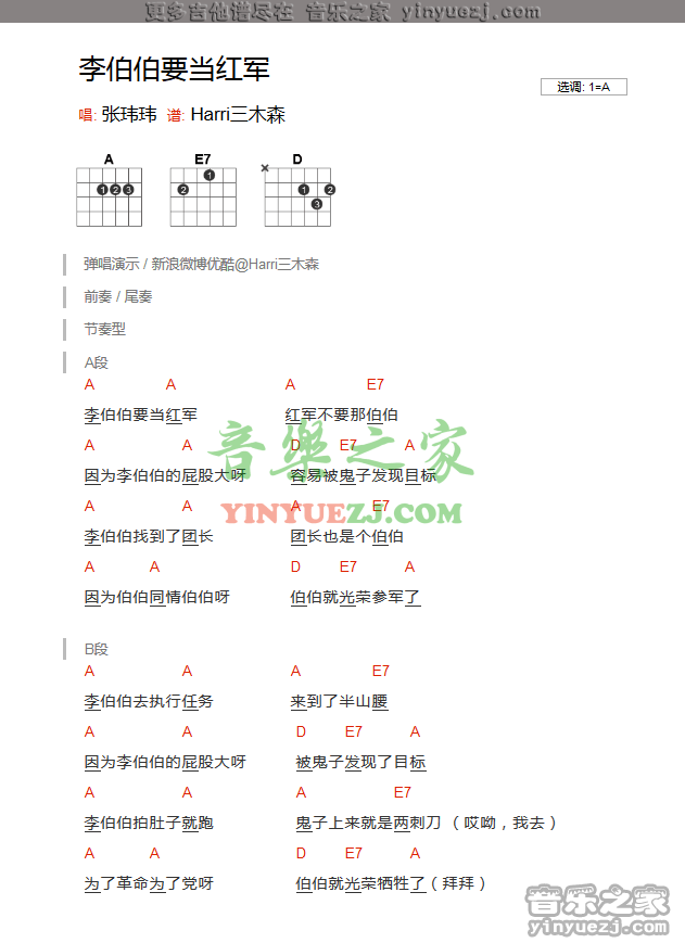 张玮玮《李伯伯要当红军》吉他谱,YYZJ编配出品,共有1张高清图谱,免翻页排版设计。...