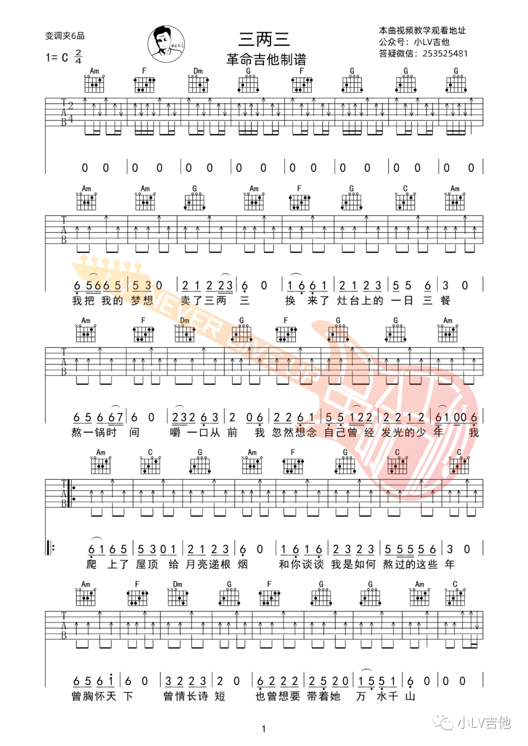 凌丰《三两三》吉他谱,革命吉他编配出品,共有3张高清图谱。...