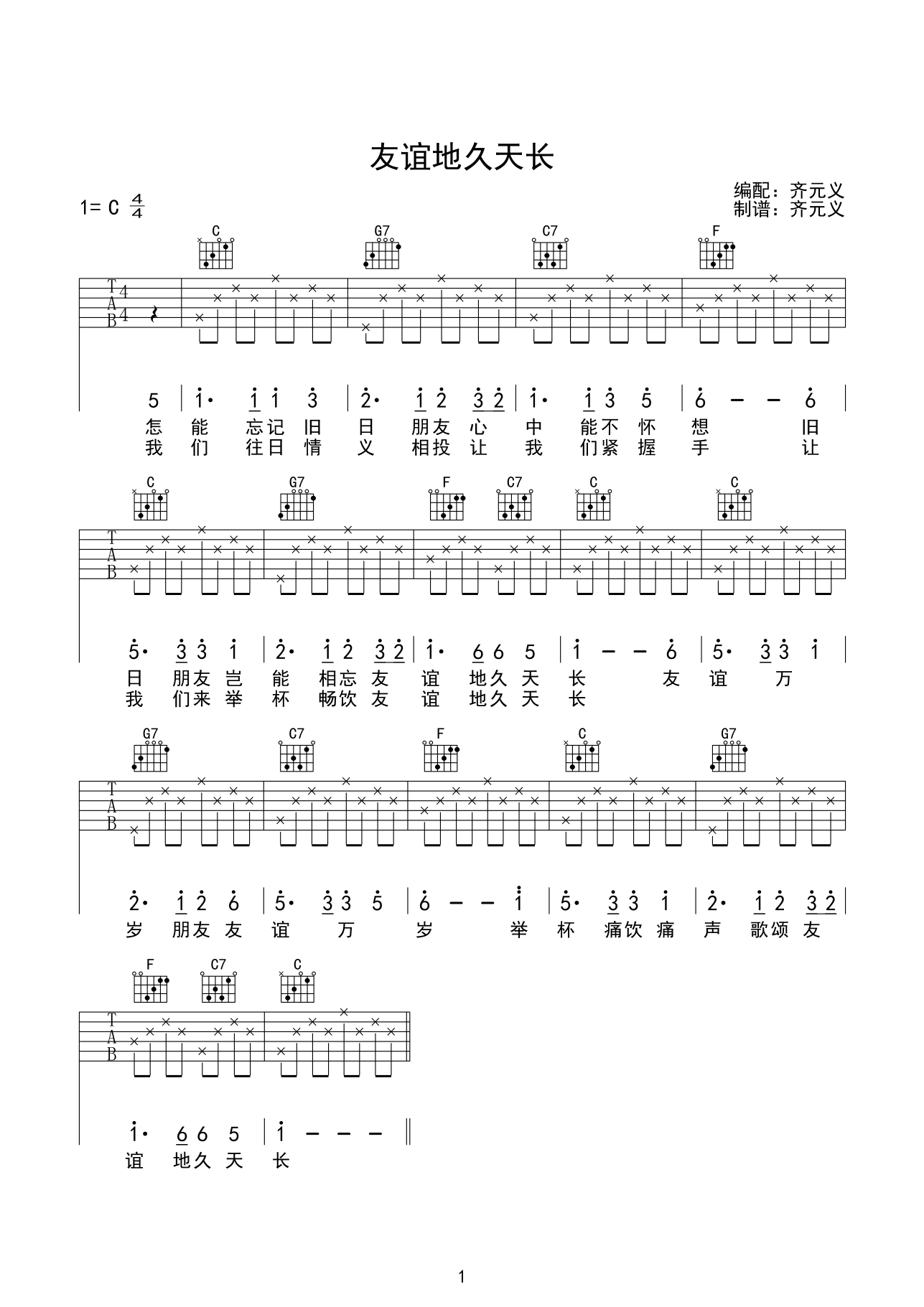 吉他儿歌《友谊地久天长》吉他谱 - 免费版