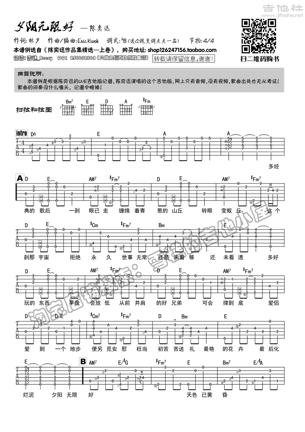 陈奕迅《夕阳无限好》吉他谱,吉他社编配出品,共有2张高清图谱,免翻页排版设计。...