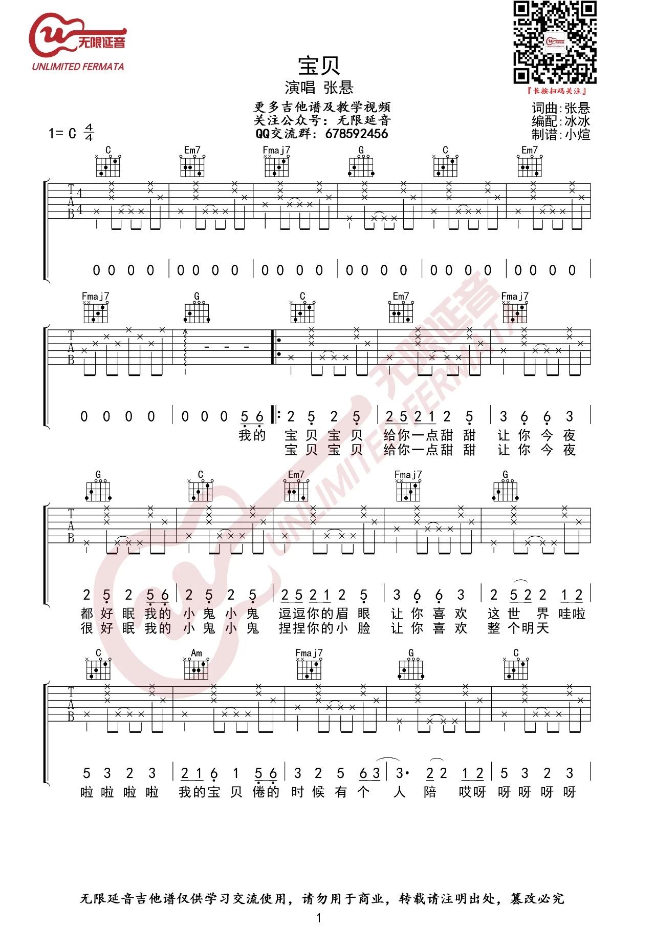 张悬《宝贝》吉他谱,无限延音编配出品,共有2张高清图谱,免翻页排版设计。...