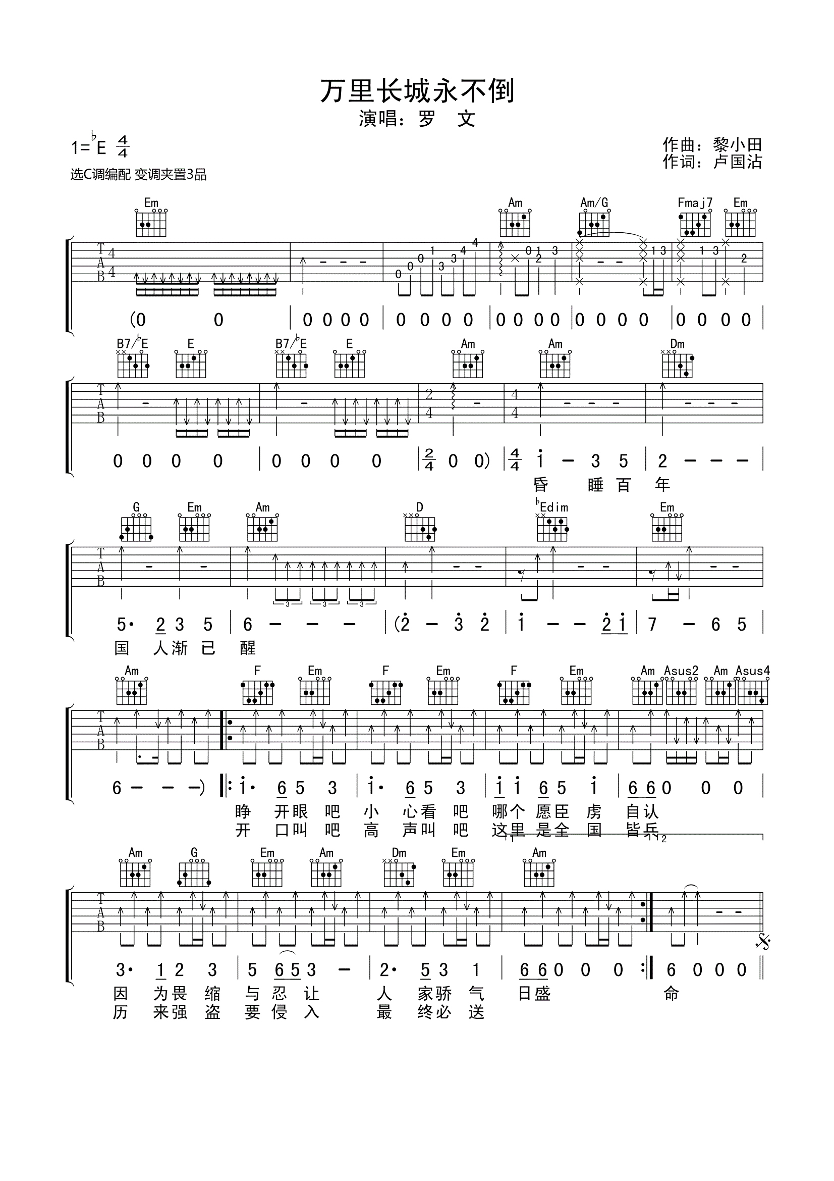 吉他罗文《万里长城永不倒》吉他谱 - 很多人都在弹的版本