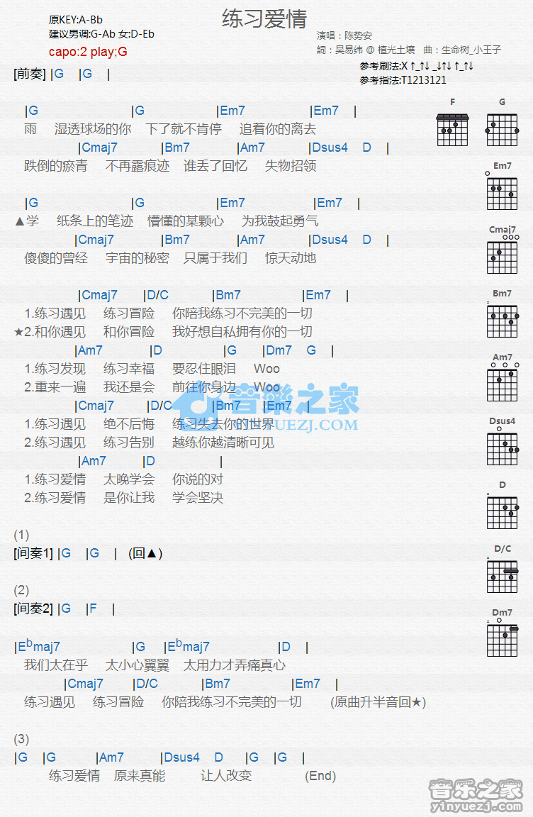 G调版陈势安《练习爱情》吉他和弦弹唱谱...