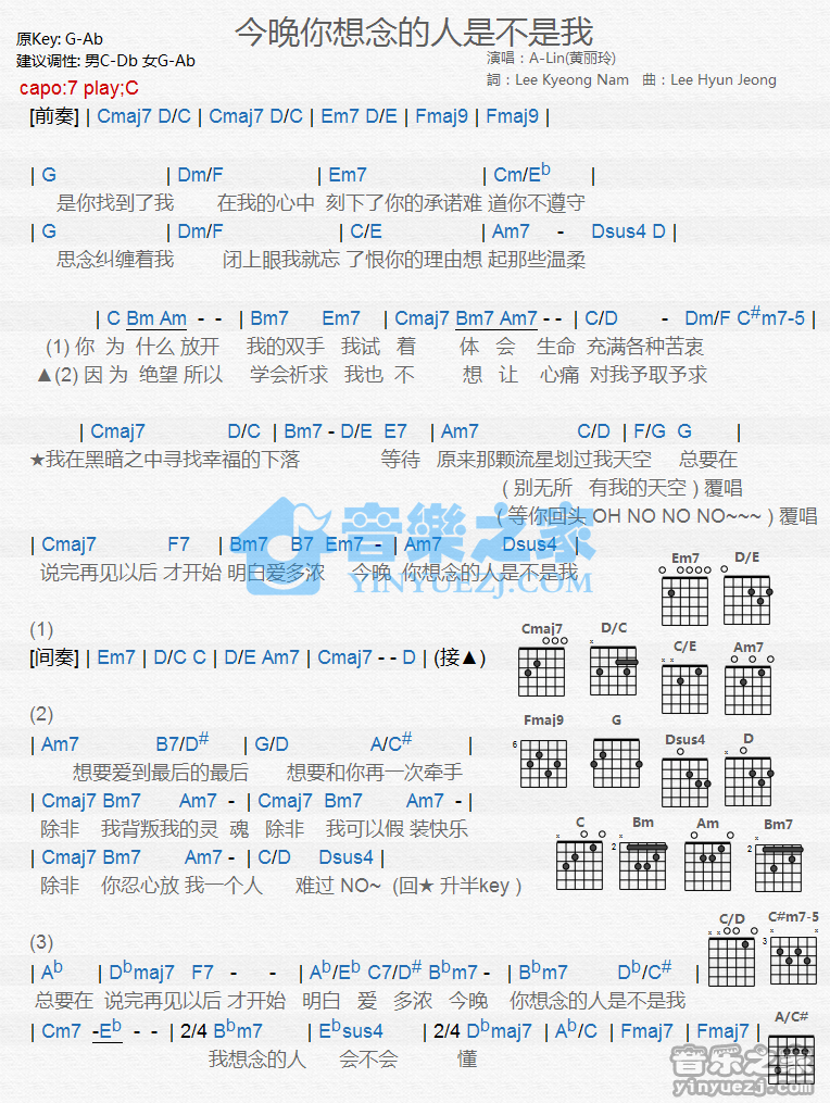 C调版《今晚你想念的人是不是我》吉他和弦弹唱谱...