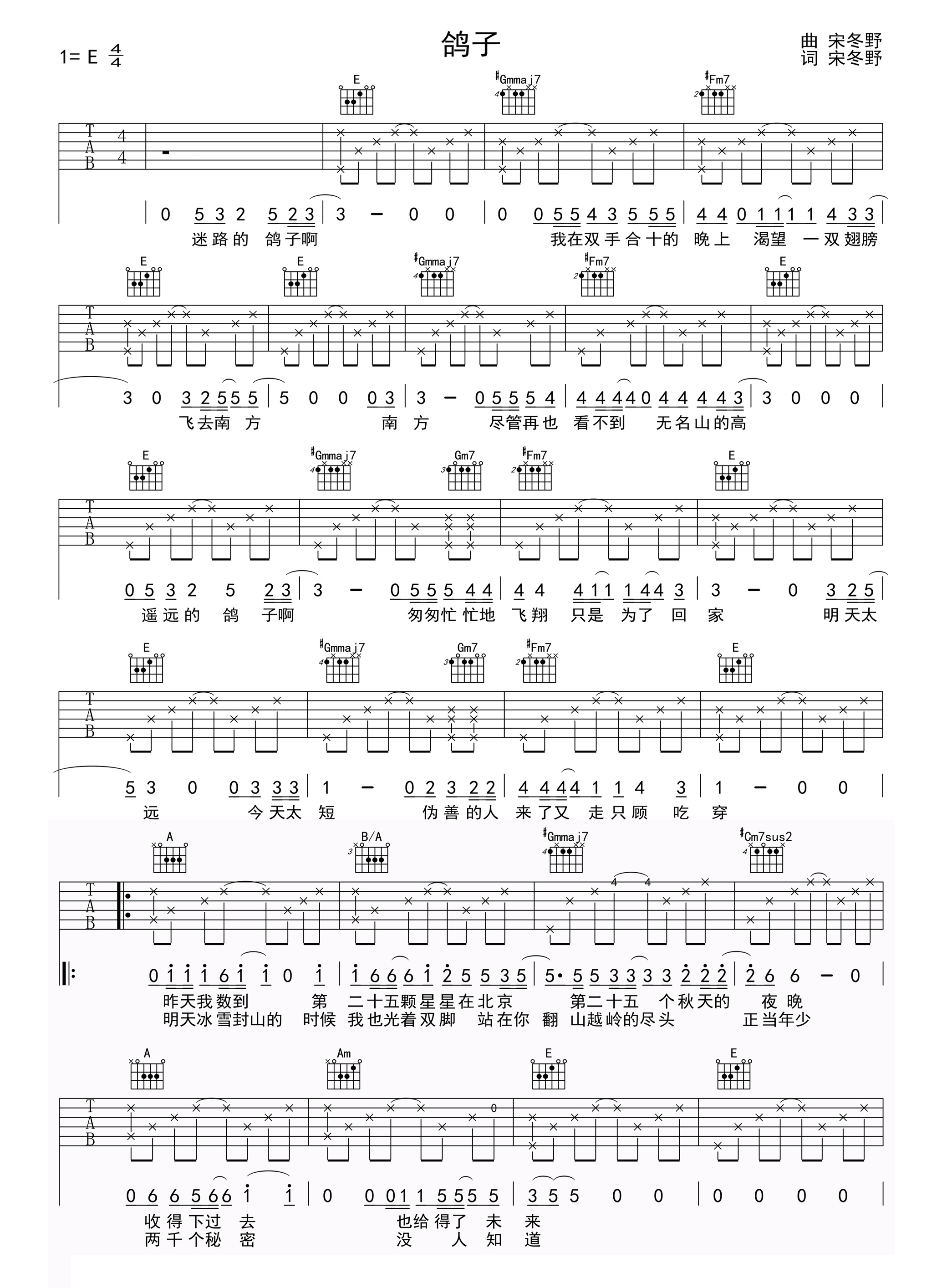 吉他宋冬野《鸽子》吉他谱 - 好听到爆炸