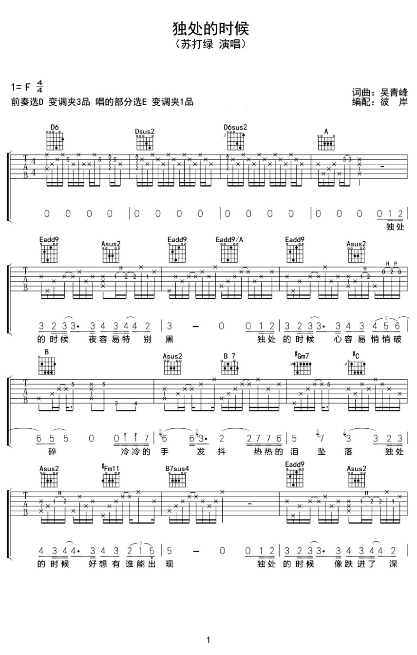 独处的时候吉他谱,六线谱编配,原调F,前奏选D,变调夹夹三品,演唱部分选E调,变调夹夹一品。独处的时候吉他弹唱谱,图片谱高清版。苏打绿的声音真是治愈系的好听,独特的声线唱出孤单的感觉,唯美的旋律中,透露出一丝丝伤感,让心情平静,慢慢的融化自己。...