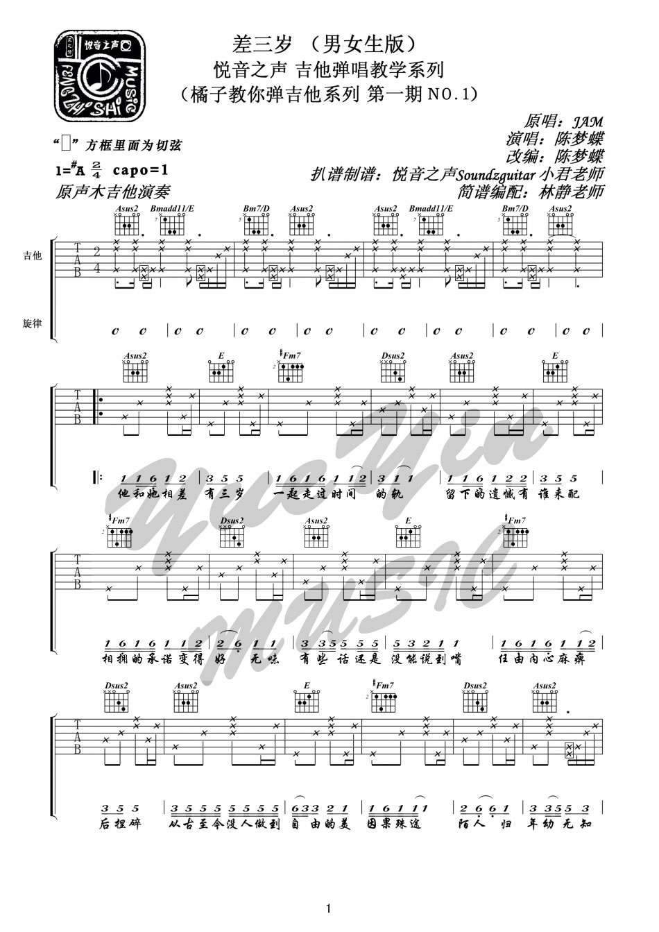 Jam《差三岁》吉他谱,男女生版,capo夹一品,一首舒服的民谣歌曲。能够阻挡爱情的也就是时间和空间了,这首Jam的《差三岁》曲调轻快歌词深刻,爱在最初是情怀。...