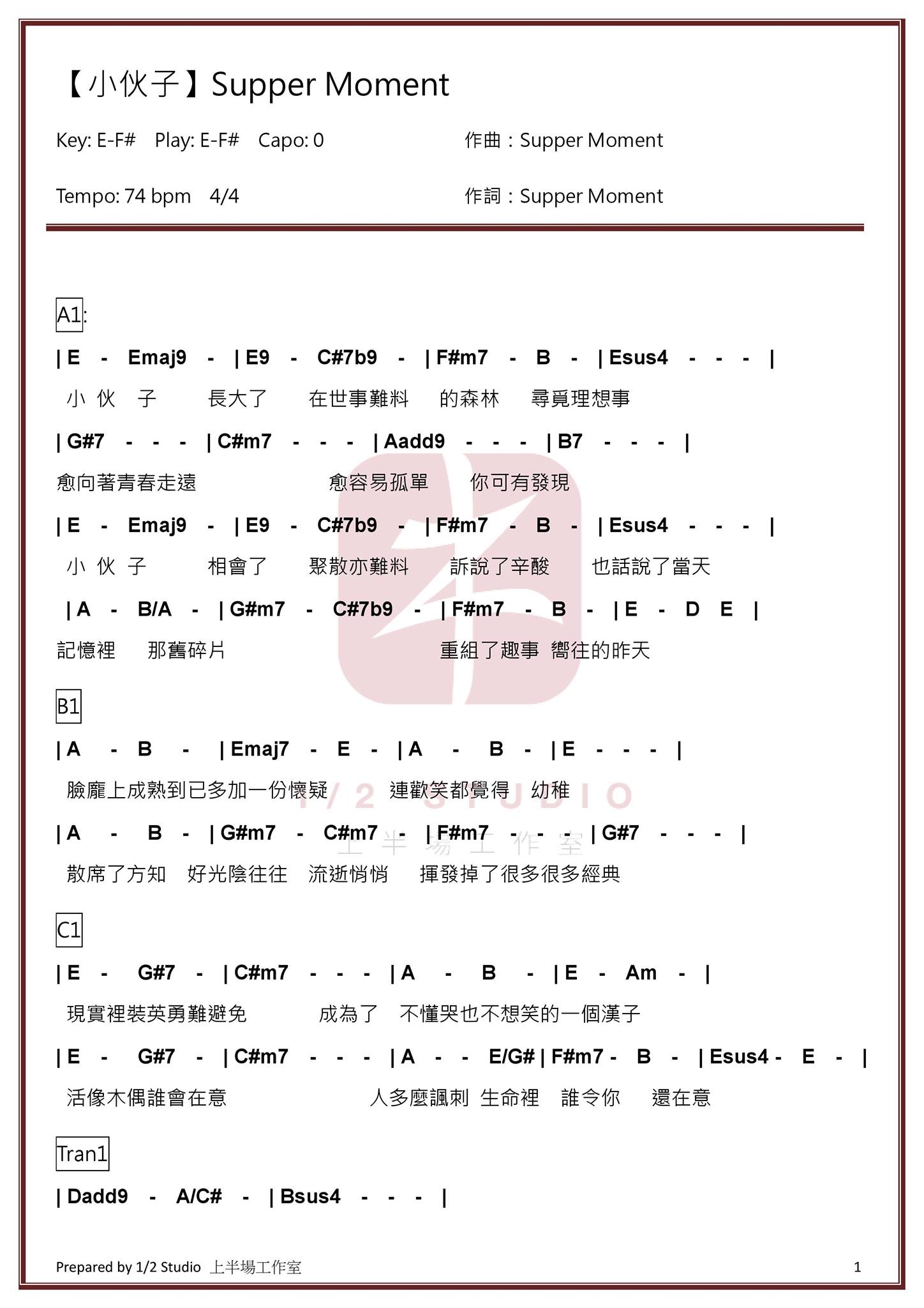 吉他SupperMoment《小伙子》吉他谱 - YYZJ编配
