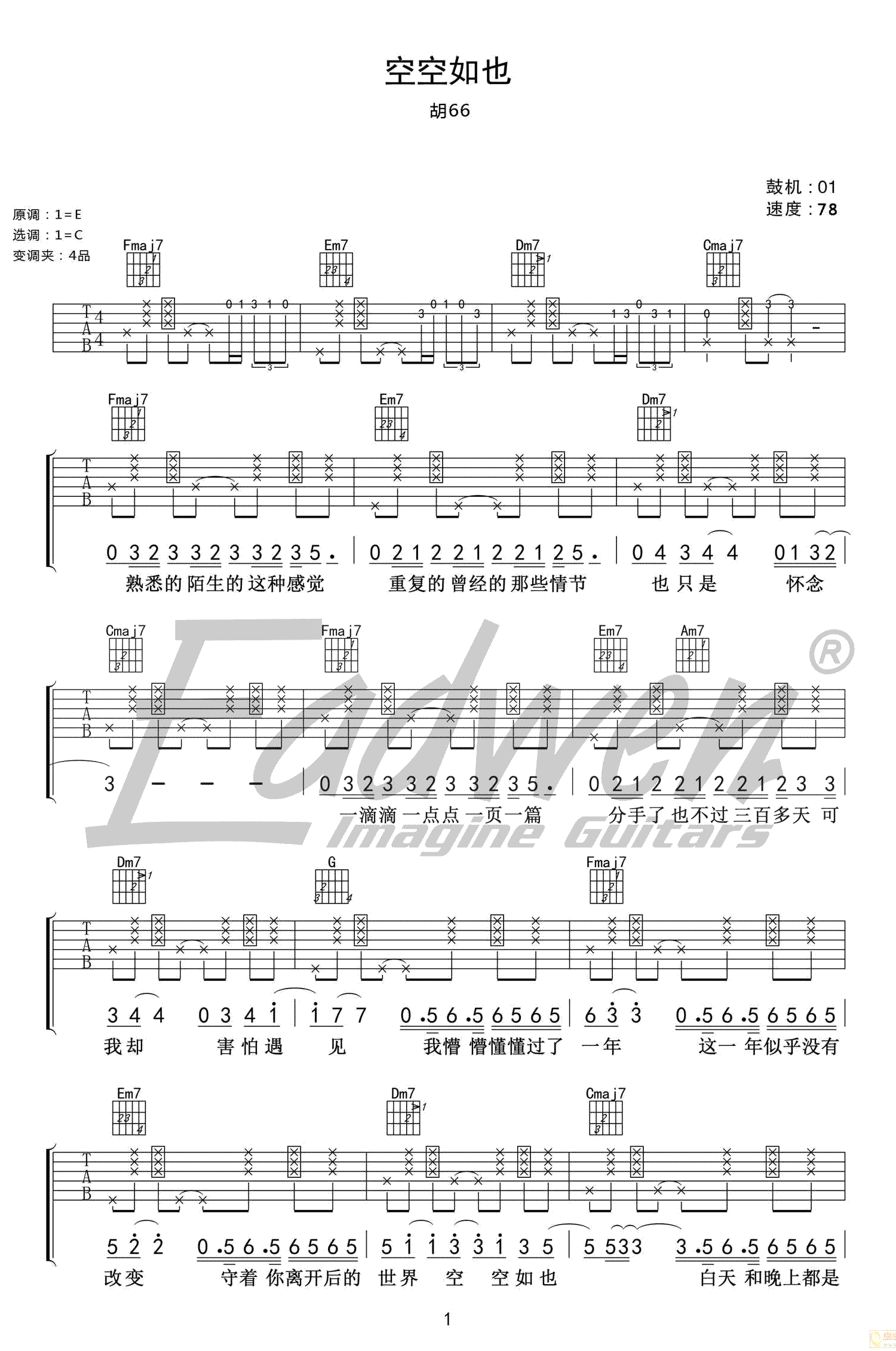 吉他胡66《空空如也》吉他谱 - 爱德文吉他编配