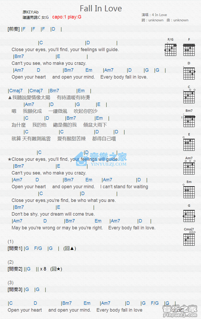 G调版4InLove《FallInLove》吉他和弦弹唱谱...
