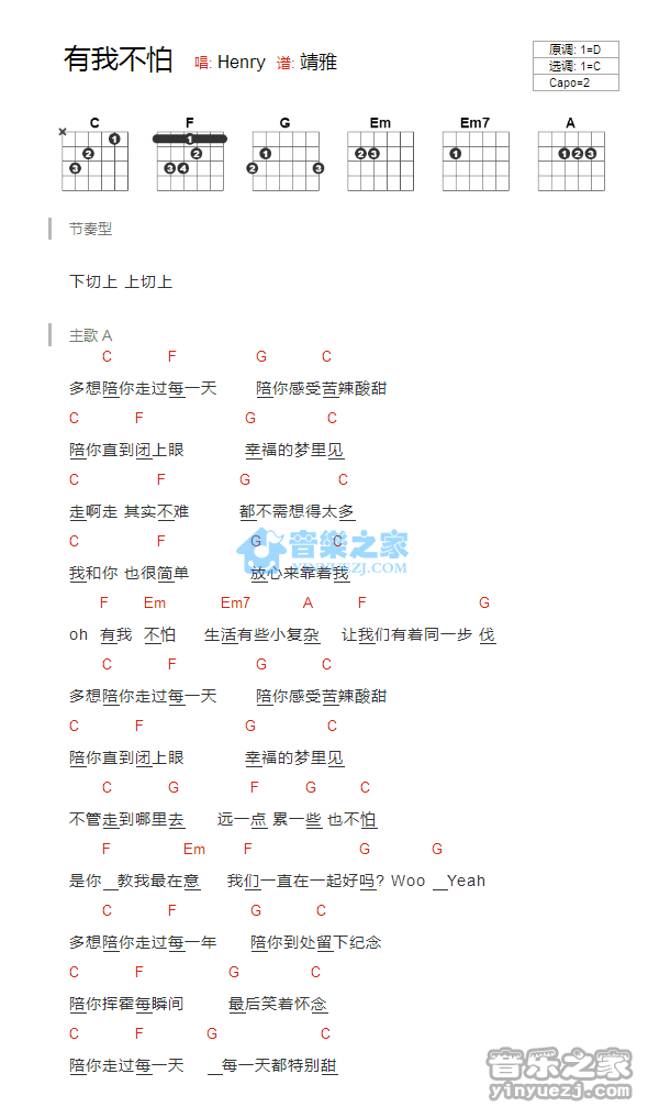 C调版Henry《有我不怕》吉他和弦弹唱谱...