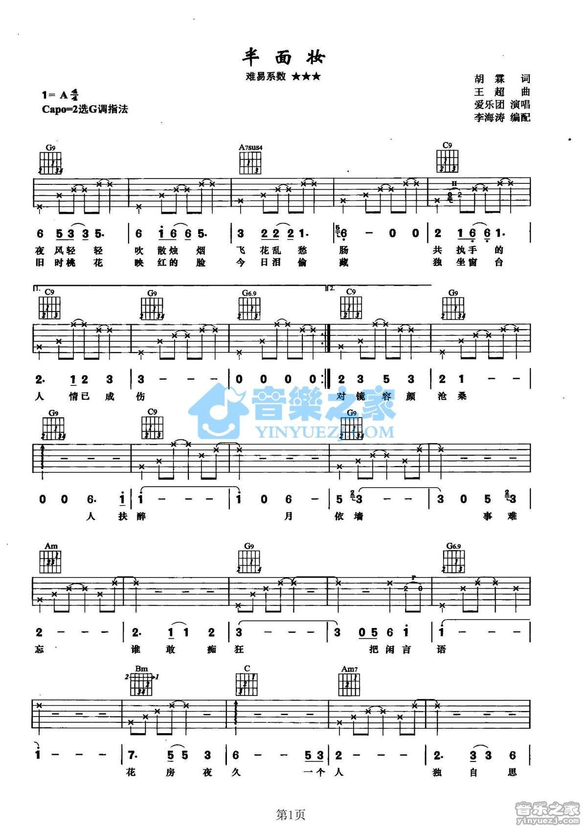 G调版爱乐团《半面妆》吉他弹唱六线谱...