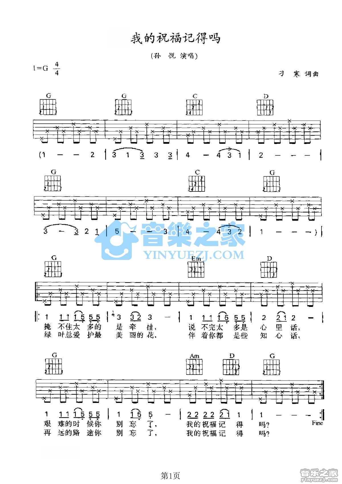 G调版孙悦《我的祝福你记得吗》吉他弹唱六线谱...