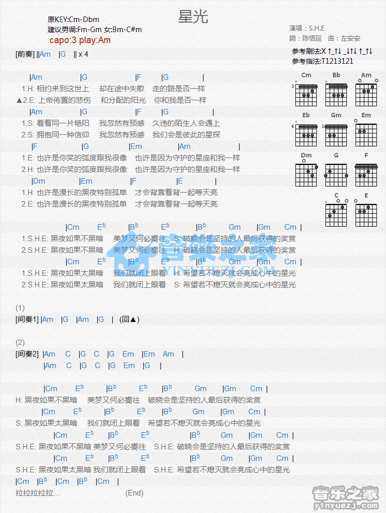 Am调版S.H.E《星光》吉他和弦弹唱谱...