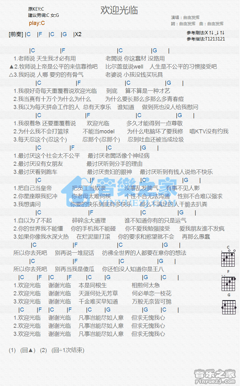 C调版自由发挥《欢迎光临》吉他和弦弹唱谱...