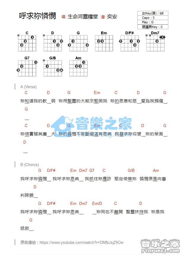 G调版生命河灵粮堂《呼求你怜悯》吉他和弦弹唱谱...