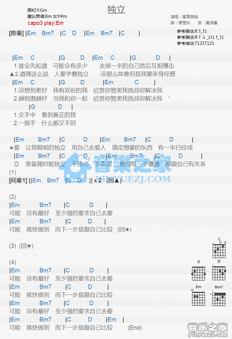 Em调版蜜雪薇琪《独立》吉他和弦弹唱谱...