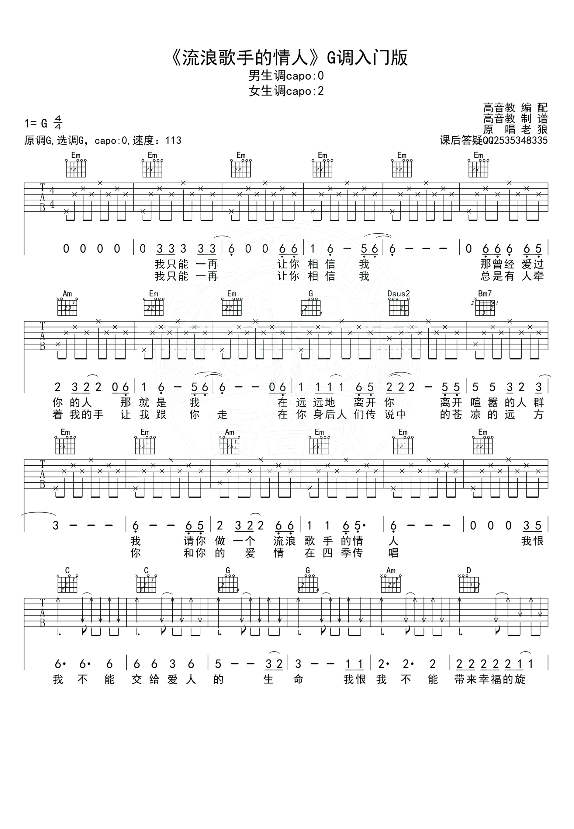 吉他老狼《流浪歌手的情人》吉他谱 - 小编推荐练习