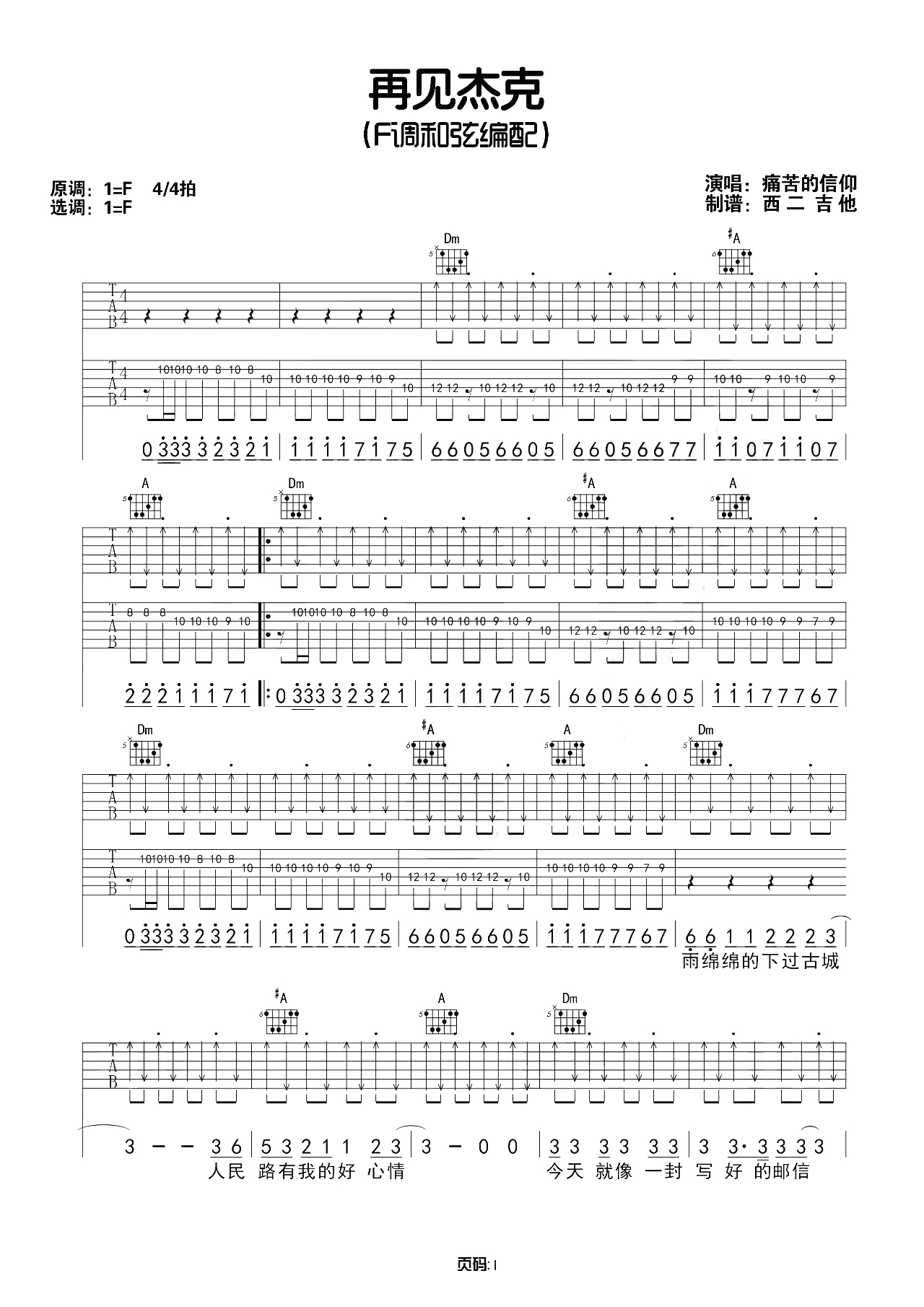 吉他痛仰乐队《再见杰克》吉他谱