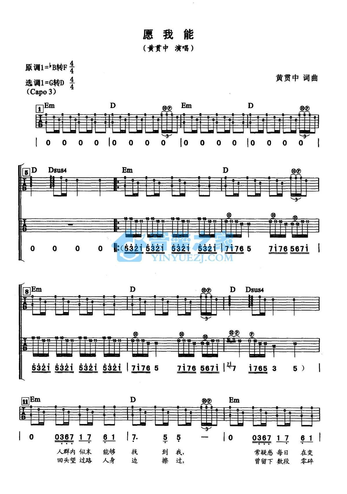吉他黄贯中《愿我能》吉他谱