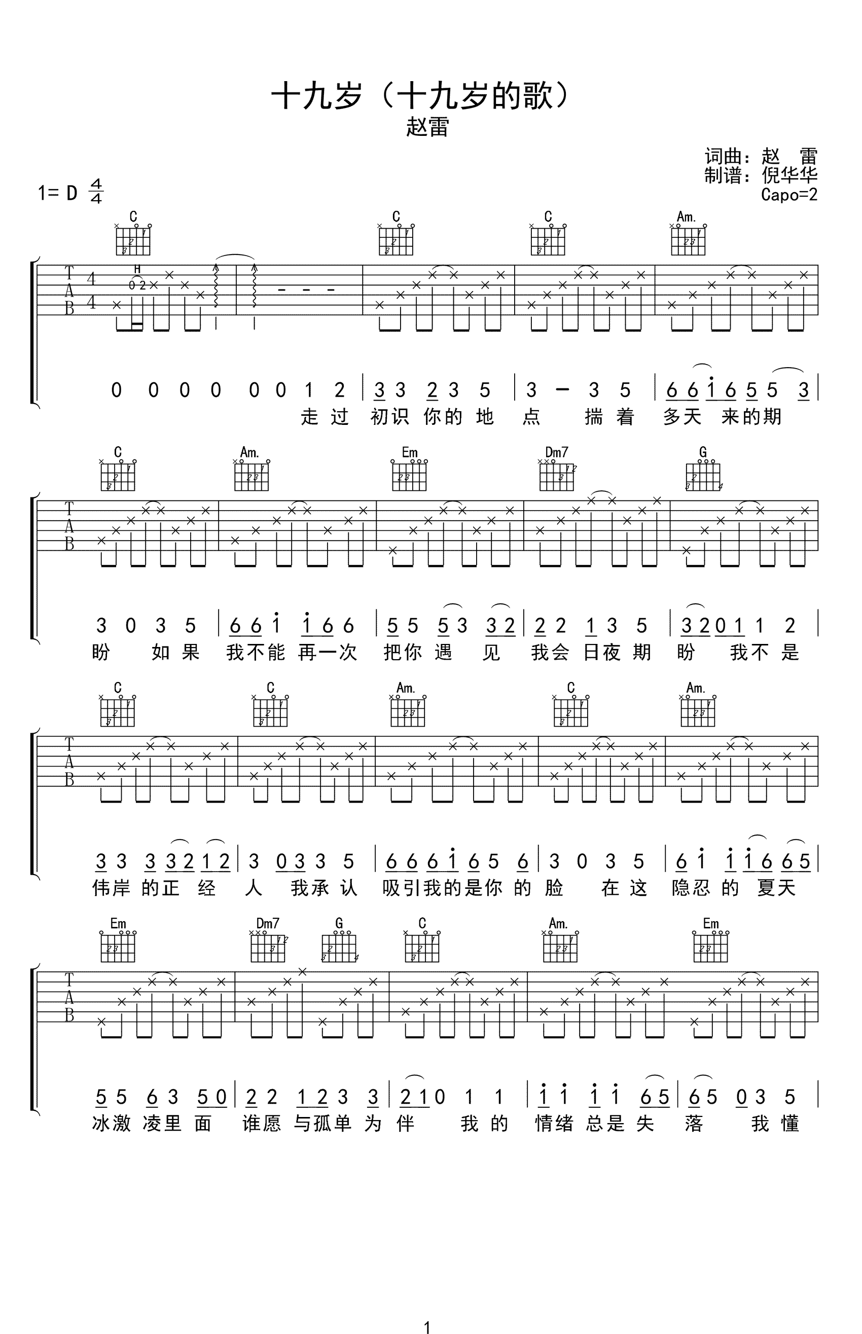 吉他赵雷《十九岁时候的歌》吉他谱 - 推荐版本