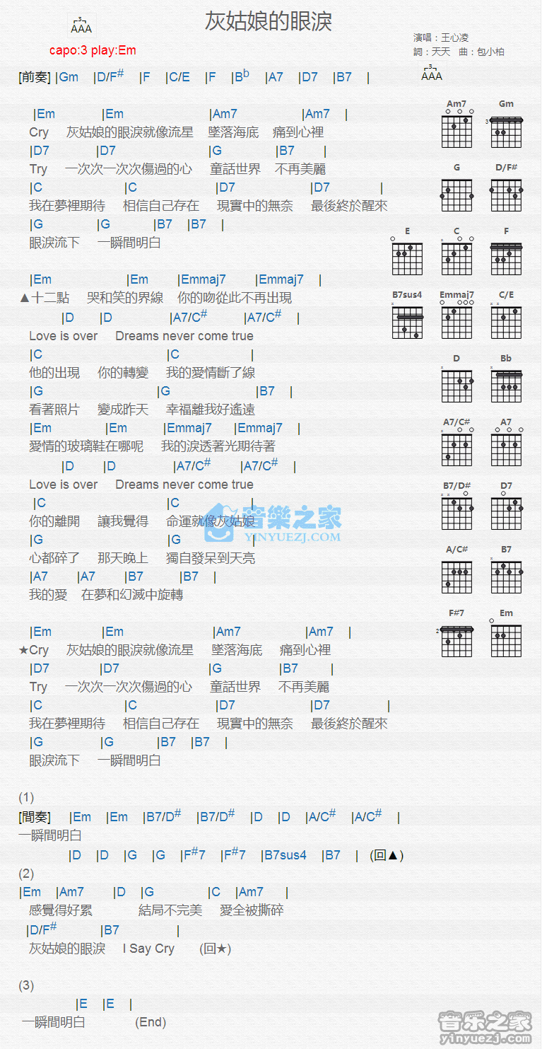 Em调版王心凌《灰姑娘的眼泪》吉他和弦弹唱谱...